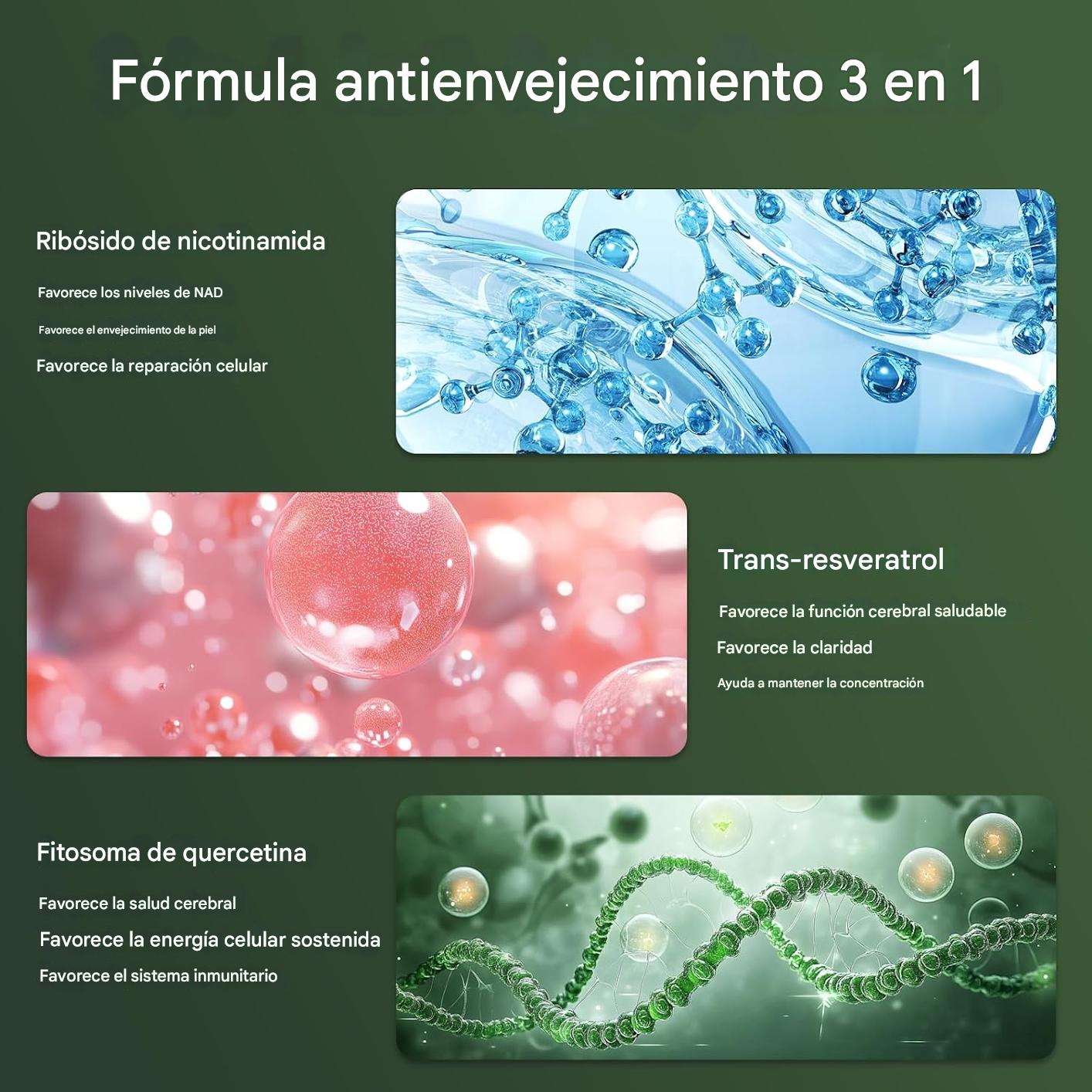 Combinado con Nicotinamida Riboside (NR) y tecnología liposomal, este suplemento potencia la producción de NAD+, una coenzima clave para la regeneración celular.